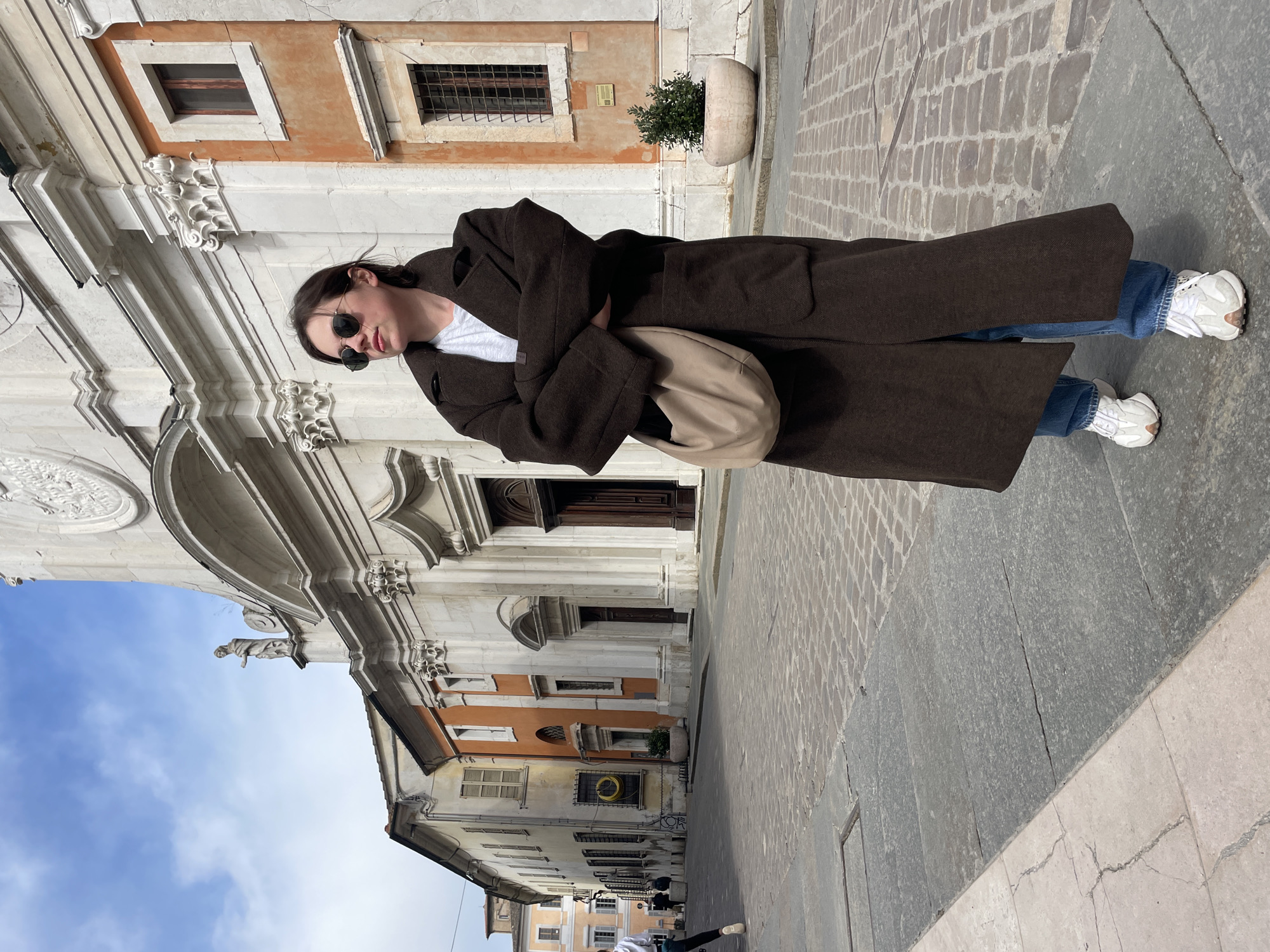 A young woman stands on a stone-paved street in Ravenna, Italy, her arms crossed. She wears a dark brown, mid-length wool coat over blue jeans, a white shirt, and white sneakers. Sunglasses obscure her eyes. She carries a tan-colored bag slung over her shoulder. To the left, a monumental white building with ornate architectural details is partially visible, its base featuring arched openings and a sculptural figure. Above, a cloudy blue sky is seen. In the background, a row of multi-story buildings with windows and varying colors lines the street. A small bush in a pot sits along the building wall. People walk in the far distance.