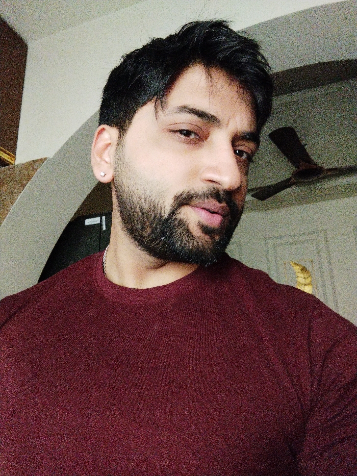 This image presents a close-up portrait of an adult male in an indoor setting. The subject, with dark hair, a full beard, and a mustache, faces the camera directly with a slight head tilt and partially parted lips. He wears a maroon long-sleeved crew-neck garment. A silver-colored chain is visible around his neck, and a small, square, silver-colored stud earring is present in his left earlobe. The background consists of light-colored walls. Visible architectural details include a segment of an archway behind the subject's left side and a dark, three-bladed ceiling fan partially visible in the upper right. A light-colored, textured decorative object and faint wall paneling are also present behind his right shoulder. The scene is located indoors in the city of Bidhannagar, India.
