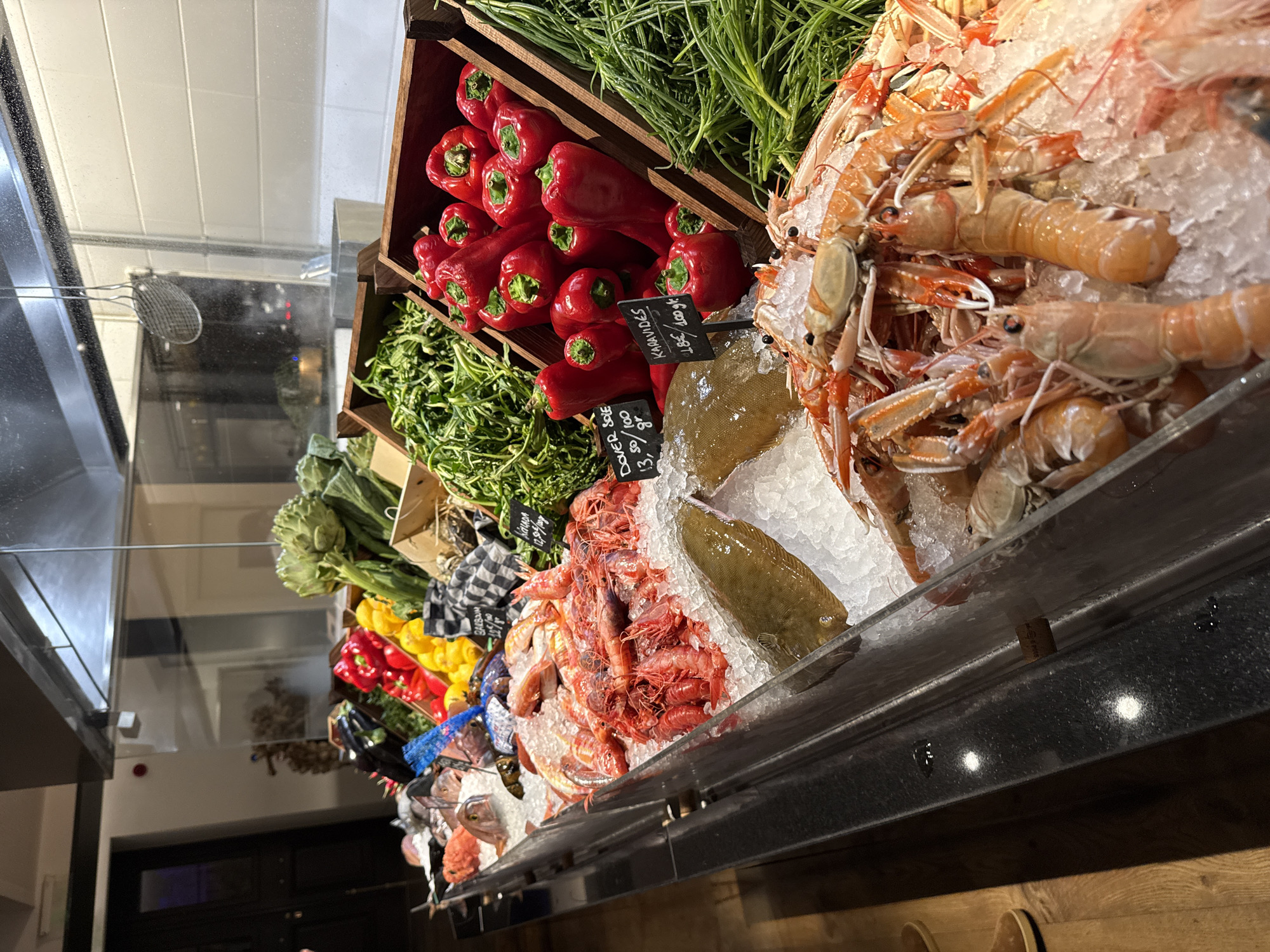 An illuminated, upscale display counter in an establishment located in Athens, Greece, showcases fresh seafood and vegetables on crushed ice. The counter features various whole fish, including red snapper and red mullet, along with numerous shrimp and orange langoustines (Karavides). Two flatfish, identified by a sign as "DOVER SOLE 13,50 / 100 gr," are prominently displayed. Another sign lists "KARAVIDES 18€ / 100 gr." Behind the seafood, wooden crates contain vibrant red bell peppers, dark green leafy vegetables, and artichokes. The background reveals an open kitchen area through a glass partition, featuring a stainless steel hood, a hanging spider strainer, and white tiled walls. Dark wooden double doors are visible on the far left. The flooring is wooden. No individuals are present in the scene.