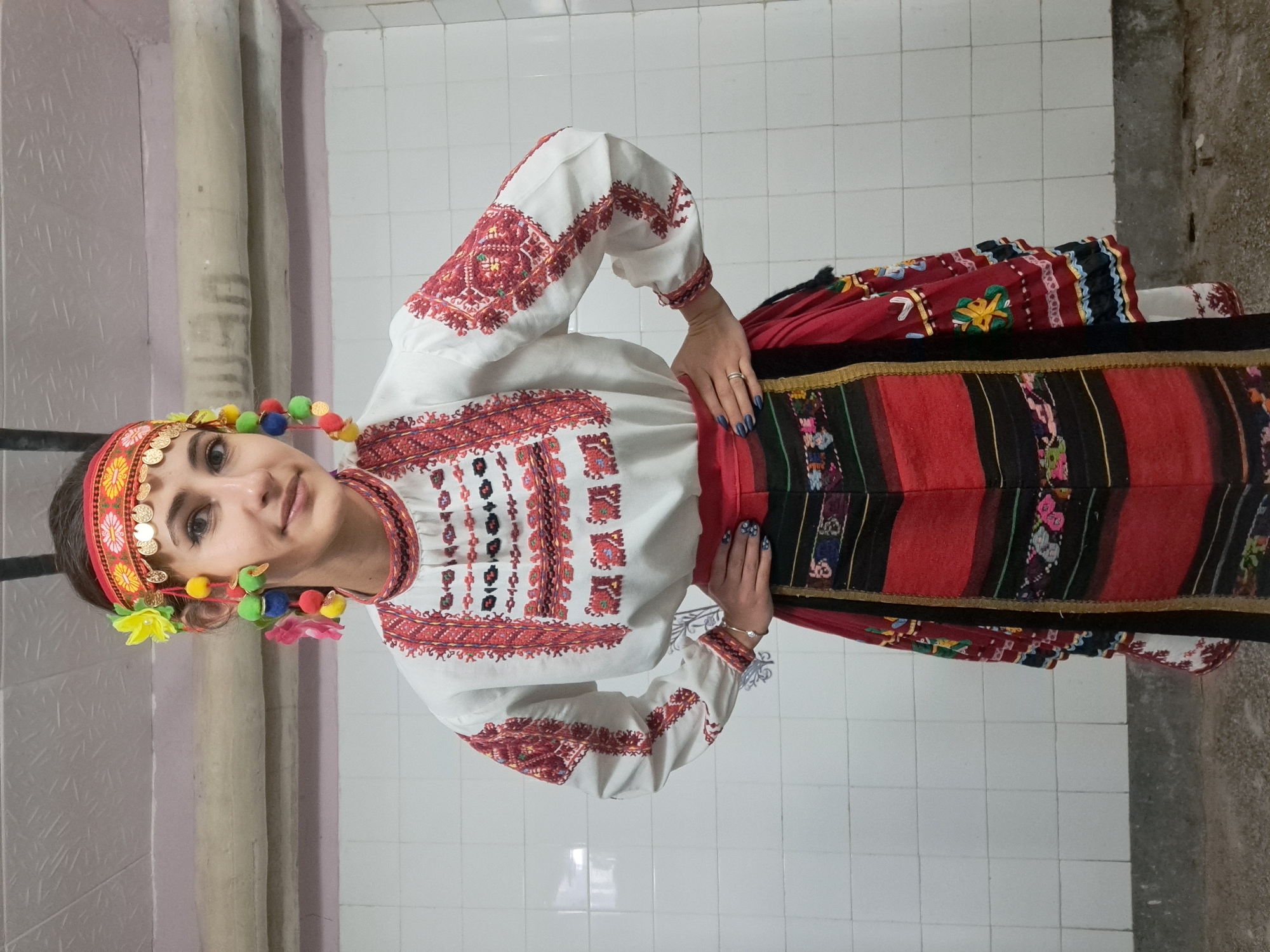 woman in traditional Bulgarian folk attire, possibly in Lokorsko, Bulgaria