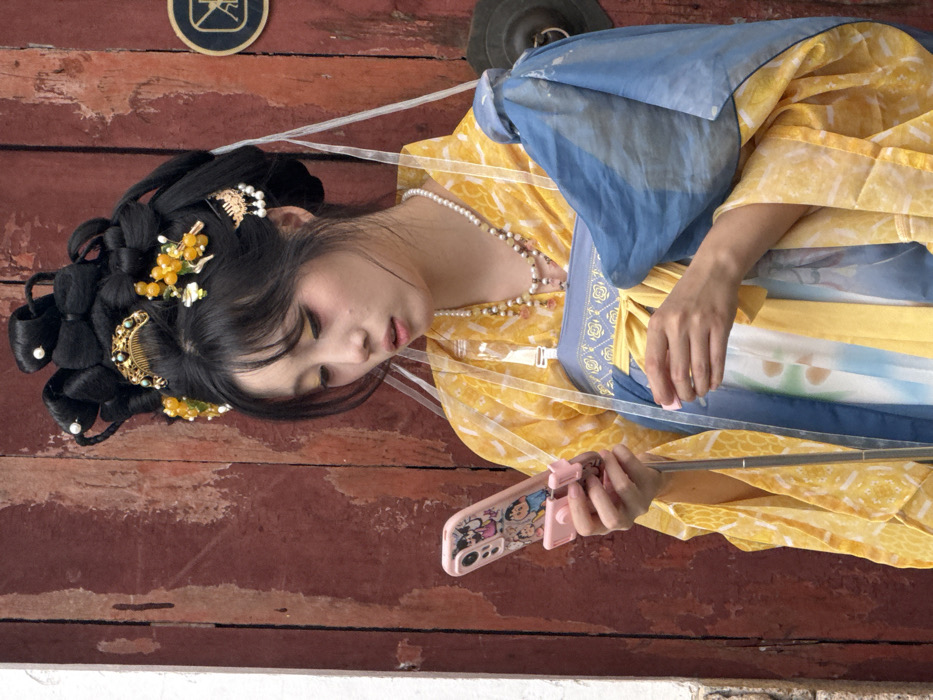 The image captures a young East Asian female located in the Qinhuai District, China, standing against a reddish-brown wooden door or wall. She wears traditional Chinese attire, featuring a translucent yellow outer garment with a geometric pattern over an inner blue and white patterned layer. Her black hair is styled intricately with multiple loops and adornments, including gold-colored ornaments with yellow beads, pearl-like accents, a decorative comb, and white translucent ribbons. Her makeup includes yellow eyeshadow and discernible blush. She is accessorized with a white pearl necklace and a multi-strand necklace of smaller pearls and pink beads. Her left hand holds a pink smartphone, encased in a cartoon-themed cover depicting Crayon Shin-chan characters, and attached to an extended pink selfie stick; her attention is directed towards the screen. Her mouth is slightly ajar. The background consists of vertically paneled wooden architecture. To the far right, a dark, circular door fixture and a partially visible black sign with a white 'no' symbol are present.