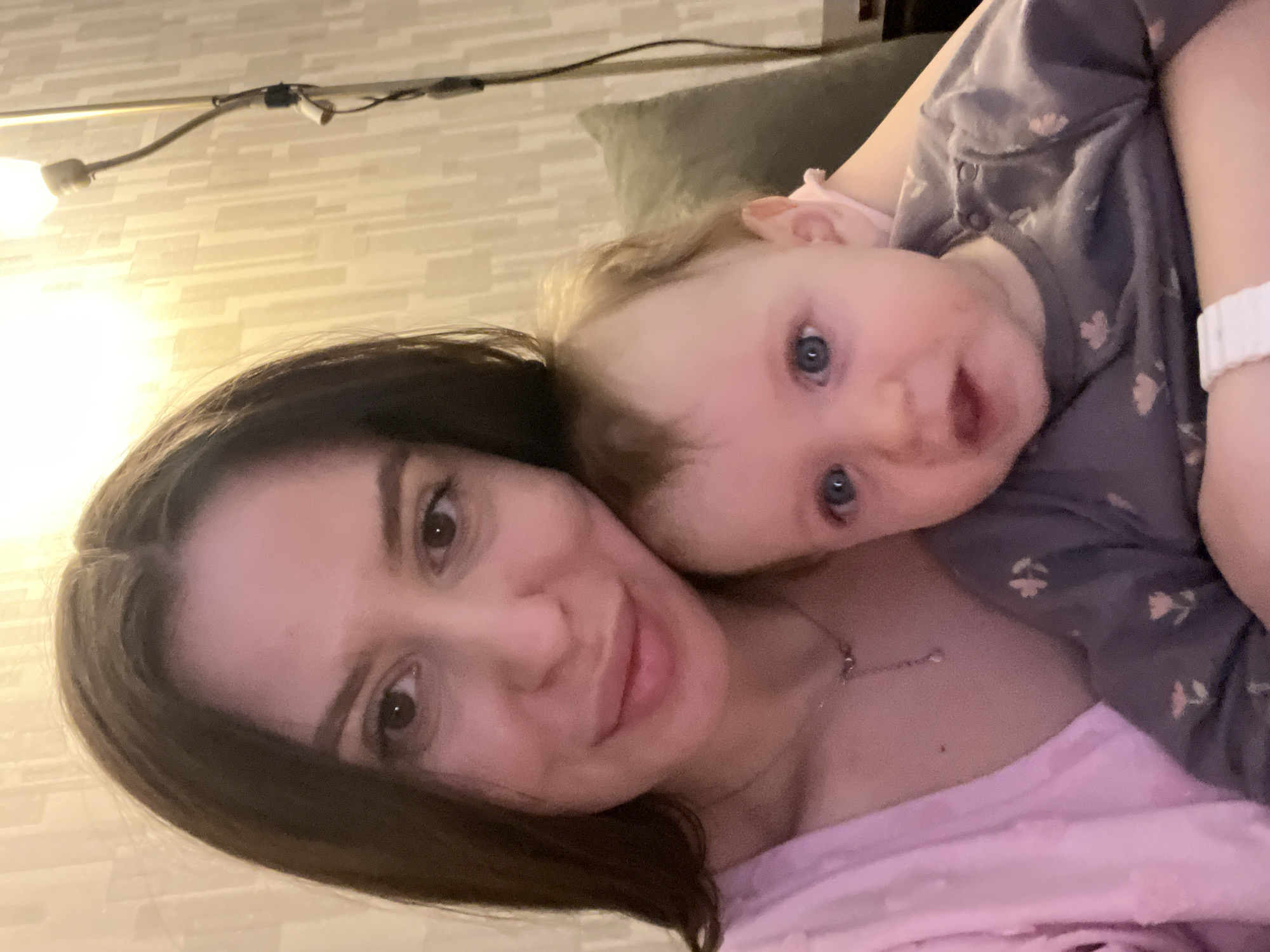 An adult female and an infant are present indoors in Mytishchi, Russia. The adult female, with dark brown hair, wears a light pink textured top and a delicate pendant necklace, smiling directly at the camera. She holds an infant with light hair and blue eyes, dressed in a grey long-sleeved top with a light floral pattern. The infant's mouth is slightly open, and a faint reddish mark is visible around the chin. A white wristband is on the infant's left wrist. The background consists of a light-colored wall featuring a subtle patterned wallpaper with vertical rectangular elements. Warm artificial light illuminates the scene, with a floor lamp visible on the right side of the frame. A dark grey cushion and dark furniture are partially visible behind the infant.