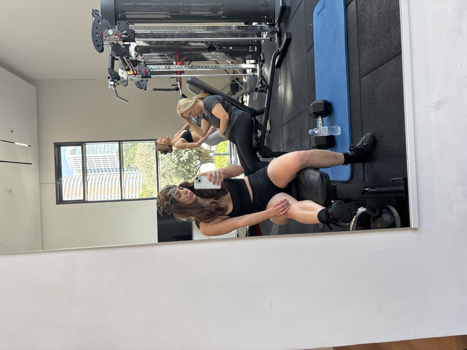 The image displays a gym interior in Givatayim, Israel, captured as a mirror selfie. In the reflection, three adult females are present. The foreground is occupied by a young adult female with long dark hair, wearing a camouflage bandana, a black crop top, and black athletic shorts. She is seated on a black weight bench, holding a white smartphone to capture the image. Her left foot rests near a black kettlebell, partially visible in the bottom left. Adjacent to her bench on the dark grey rubber floor, a blue exercise mat is unrolled, holding a clear plastic water bottle and a black hexagonal dumbbell. In the mid-ground, a second young adult female with light brown hair styled up stands, wearing a black sports bra and light grey leggings, looking towards a large window. Next to her, an older adult female with blonde hair sits on a black adjustable weight bench, dressed in a dark grey t-shirt and black leggings. Her left hand is raised to her forehead. To the right of the seated woman, a black multi-functional cable machine is visible. The background features a large window overlooking an urban landscape with modern high-rise buildings and green trees, consistent with the city environment of Givatayim. The gym walls are light-colored, and the ceiling is white with two linear light fixtures. A dark rectangular screen is partially visible on the wall to the left of the window.