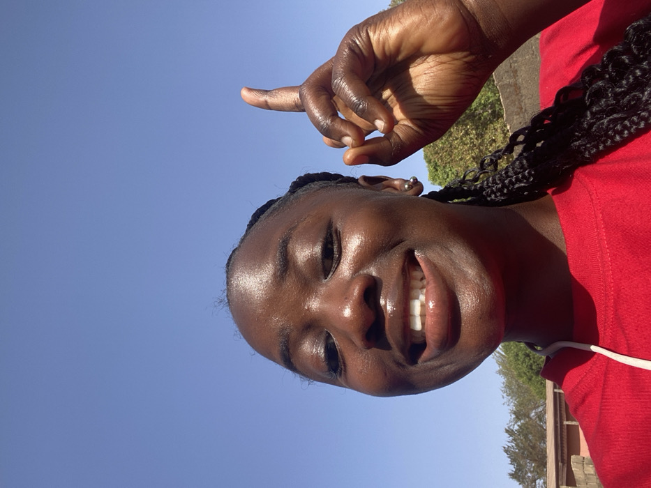 This image depicts a close-up, low-angle selfie of a young adult female in an outdoor setting within Sabon Tasha, Nigeria