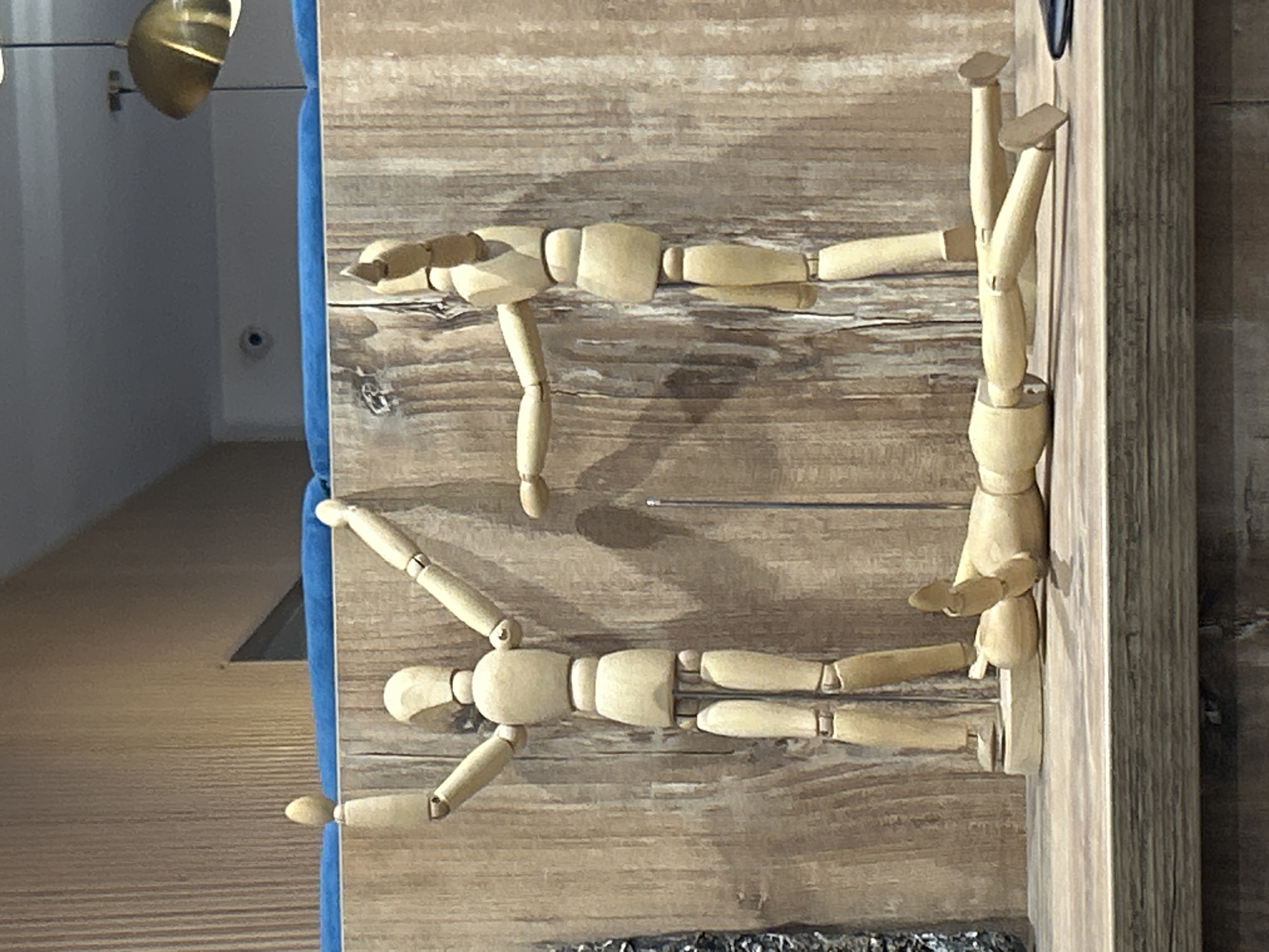 The image depicts a wooden art piece featuring three articulated wooden figures, possibly mannequins, arranged on a wood-paneled surface