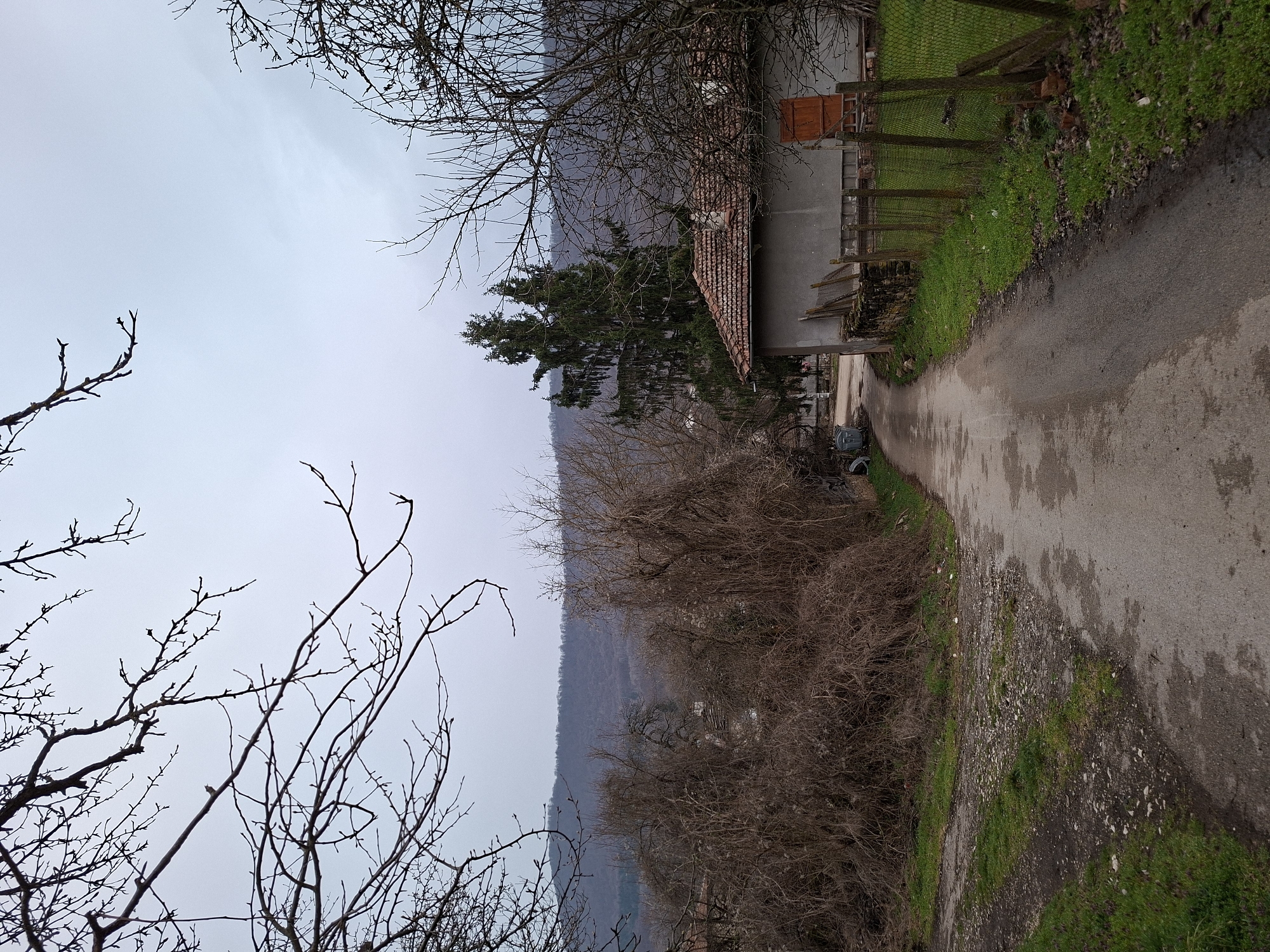 The image depicts a rural scene in Balgarene, Bulgaria, under an overcast grey sky. A narrow, damp asphalt road curves slightly to the left, receding into the midground. To the immediate left of the road, a dirt path merges with it, bordered by patches of green grass and gravel. A large, dense mass of bare, dried brush and tangled branches occupies the left foreground and midground. On the right side of the road, a strip of green grass borders a weathered wooden fence with green wire mesh, which encloses a property. Further along the right side of the road, a single-story house with a reddish-brown tiled roof and light grey stucco walls is visible, featuring a brown wooden door on its right facade and a chimney on the roof. Behind this house, two tall, dark green coniferous trees, possibly firs, stand prominently. A grey waste bin is visible on the left side of the road further in the distance. The background features a range of hills or mountains covered in bare, deciduous trees, appearing hazy under the dull sky. No individuals or specific actions are discernible.