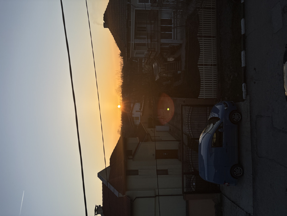 The image displays a residential scene in Stefan Karadja, Bulgaria, at either sunrise or sunset. The sky transitions from light blue at the zenith to an orange-yellow hue near the horizon, where the sun is visible as a distinct orange disc. A single white contrail from an aircraft is present in the upper-left quadrant of the sky. Two dark, parallel power or communication lines traverse the upper-mid section of the frame. In the immediate foreground, a dark, paved surface, likely a road, is partially visible, with a small section of a vehicle roof at the very bottom edge. A blue compact panel van is parked on a light-colored paved driveway to the left, oriented towards the right. White and black striped curb stones delineate the edge of the paved road. On the left side of the frame, a two-story house with a light-colored facade and a red tiled gabled roof features a dark chimney. Its front property is enclosed by a dark metal fence and gate. On the right, another two-story house is visible, characterized by a reddish-brown tiled hip roof and an enclosed balcony or porch on its upper level. A thin plume of smoke rises from a chimney on this house's roof. A white picket fence encloses this property. A dense line of leafless trees forms the horizon line behind the houses, silhouetted against the bright sky. A prominent green-yellow lens flare, an optical artifact, is visible in the lower-mid right portion of the image. No individuals are discernible in the scene.