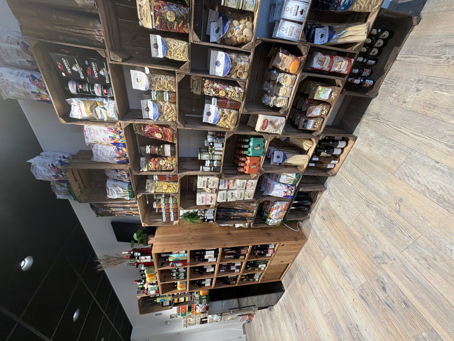 A store display of Italian products features wooden crates stacked with pasta, olive oils, and sauces