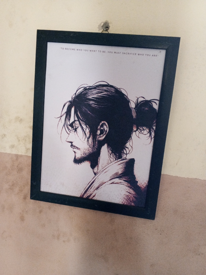 A black-framed, vertically oriented picture is mounted on a light beige wall in Lokoja, Nigeria. The frame is suspended by a metallic eye hook embedded directly above its top center; plaster damage and chipping are visible around the fixture. The wall surface is discolored with multiple dark brown and black stains, indicative of dirt or mold, particularly in the upper left area and below the frame. The framed artwork features an anime-style illustration of a male figure depicted in left profile. He has dark, unkempt hair tied into a low bun, a dark goatee, and a contemplative or intense expression. He wears a garment consistent with a hooded cloak. Above the illustration, black text on a light background reads: "TO BECOME WHO YOU WANT TO BE, YOU MUST SACRIFICE WHO YOU ARE". The frame itself displays minor scuffs and dust, particularly on its lower right edge. No human subjects, direct actions, or interactions are present in the scene. The precise location within Lokoja, Nigeria, is not discernible from the visual data.