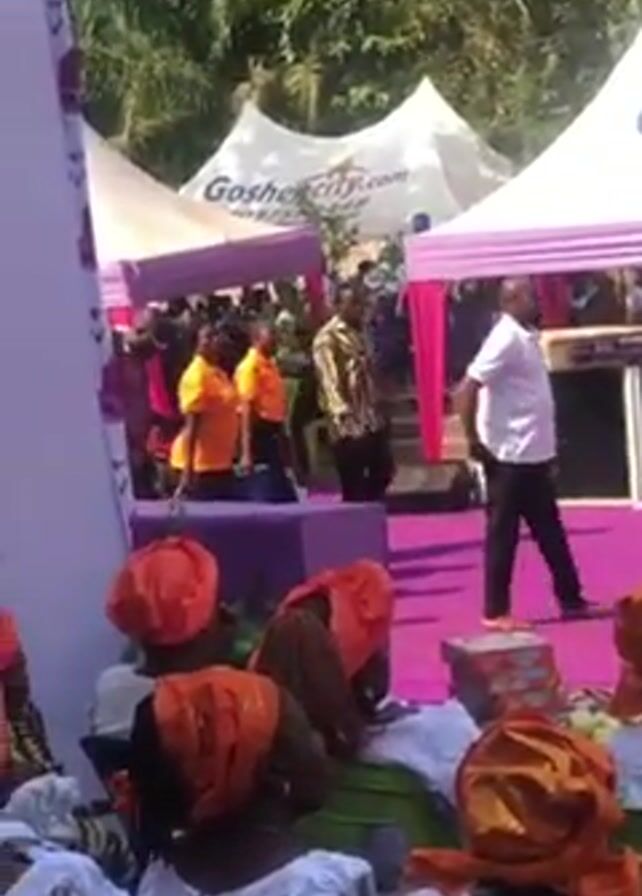 gathering of people outdoors under tents labeled "Goshencity.com." The area is decorated with purple and white fabric. Many of the attendees are wearing matching orange headscarves and white lace outfits. On a raised stage with a purple carpet, several people are walking and interacting. Some of them are wearing bright yellow shirts, while others are in traditional African clothing. One person is carrying a tray of objects, possibly food or gifts. The scene appears to be a celebratory event or ceremony.
