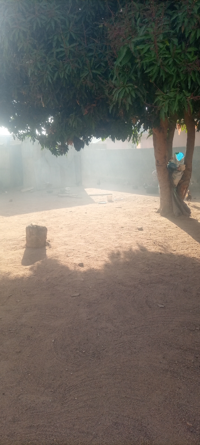 A sunny, dusty courtyard is dominated by a large leafy tree casting shadows