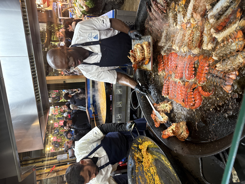 This image captures a vibrant culinary scene at Borough Market in London, United Kingdom. Two male chefs are actively preparing food at a bustling stall. The chef on the left, with dark hair and a beard, wears a white chef's coat and a dark blue apron, leaning over a large, round pan containing a steaming yellow rice dish, likely paella. The chef on the right, a Black male wearing glasses, a white chef's coat, and a dark blue apron featuring a "BOROUGH MARKET" logo, is intently cooking a large quantity of various seafood, including numerous bright red lobster tails and other crustaceans, in a massive, flat-bottomed pan filled with sizzling oil. He holds a pair of metal tongs in his left hand, actively manipulating the cooking shellfish, and a small metal tray containing additional cooked lobster segments in his right hand. Above the cooking area, a large stainless steel commercial exhaust hood is prominent. In the background, a diverse crowd of people is visible, observing the cooking or moving through the market, with festive string lights and red banners decorating the overhead structure. To the far right, a display of fresh seafood on ice is partially visible.
