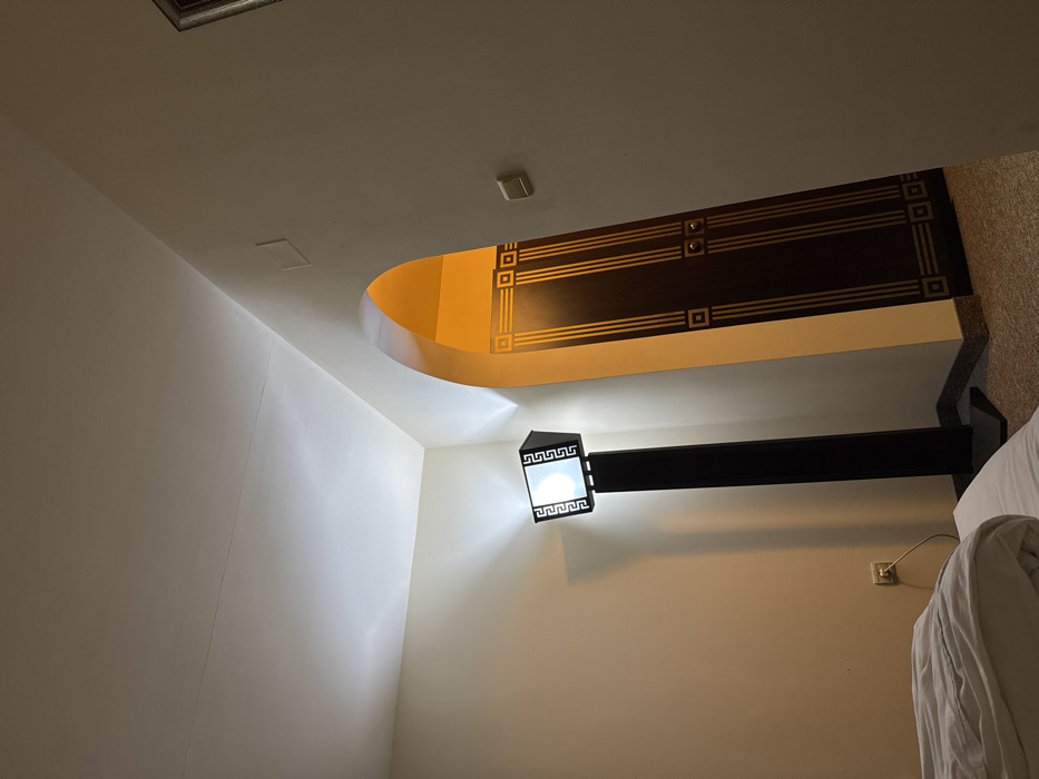 This image depicts an interior room, likely a bedroom or hotel room, located in Galabovo, Bulgaria. The scene is illuminated by artificial light sources. In the foreground, to the lower left, the edge of a bed is visible with white bedding, appearing to be a duvet or comforter. No individuals are present. A tall, rectangular floor lamp with a black base and stem is positioned to the right of the bed. Its box-shaped lampshade, primarily black, features a prominent white translucent panel on the front, bordered by a repeating black meander (Greek key) pattern. The lamp emits bright white light upwards and laterally, illuminating the ceiling and the adjacent light-colored wall. A power outlet is visible on this wall near the floor, below the lamp. To the right, an arched doorway leads to an adjacent space. The interior of the arch and the area beyond it are bathed in a distinct warm, orange-yellow light. Within this adjacent space, a dark brown door is visible, decorated with two vertical gold-colored triple-stripe patterns and three square decorative elements, each containing a smaller square, at the top, middle, and bottom. Two small, round, possibly metallic handles are present on the door's central horizontal line. A light-colored wall panel or switch is mounted on the wall to the right of the arched doorway. The room's walls and ceiling are painted in a light, off-white or cream color. A faint, linear mark is observable on the ceiling, running horizontally across the upper portion of the frame. The floor in the visible area beyond the bed, near the lamp and doorway, is covered with a light-brown carpet.