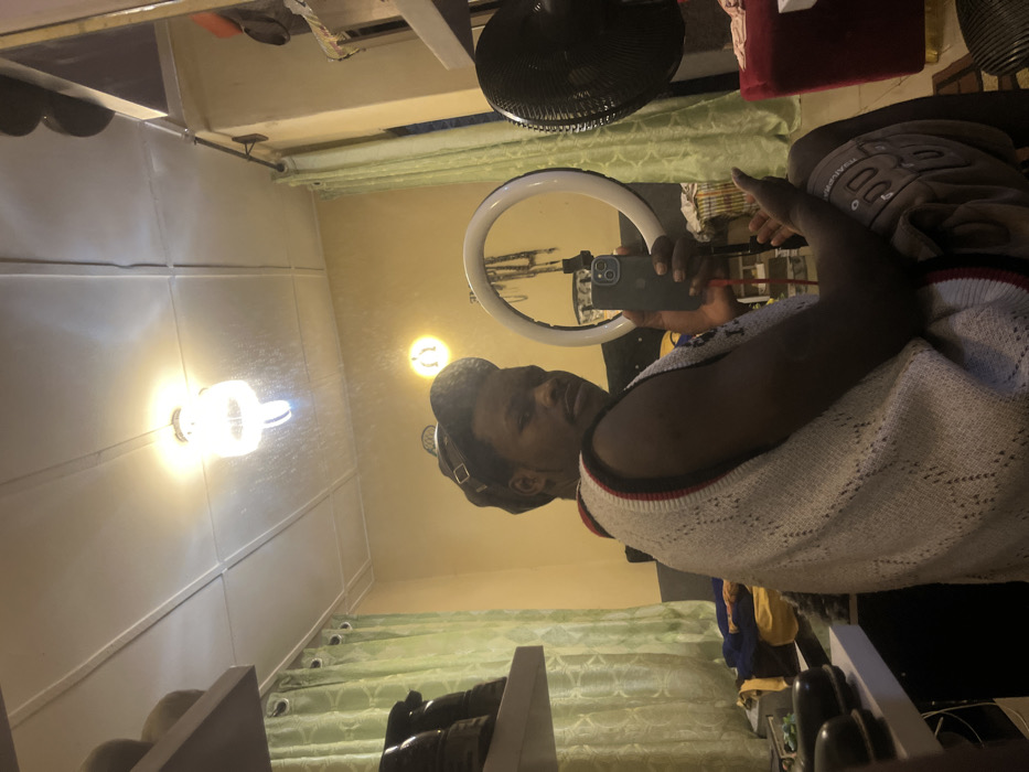 A person is reflected in a mirror, holding a smartphone in front of a ring light. The individual is wearing a sleeveless knit top and a hat. A standing fan is partially visible above the person. The room's ceiling features a bright, multi-bulb light fixture. Curtains are partially visible behind the person, and a shelf with items on it is visible on the bottom. The mirror and its surroundings are slightly dusty, and the image is rotated 180 degrees.