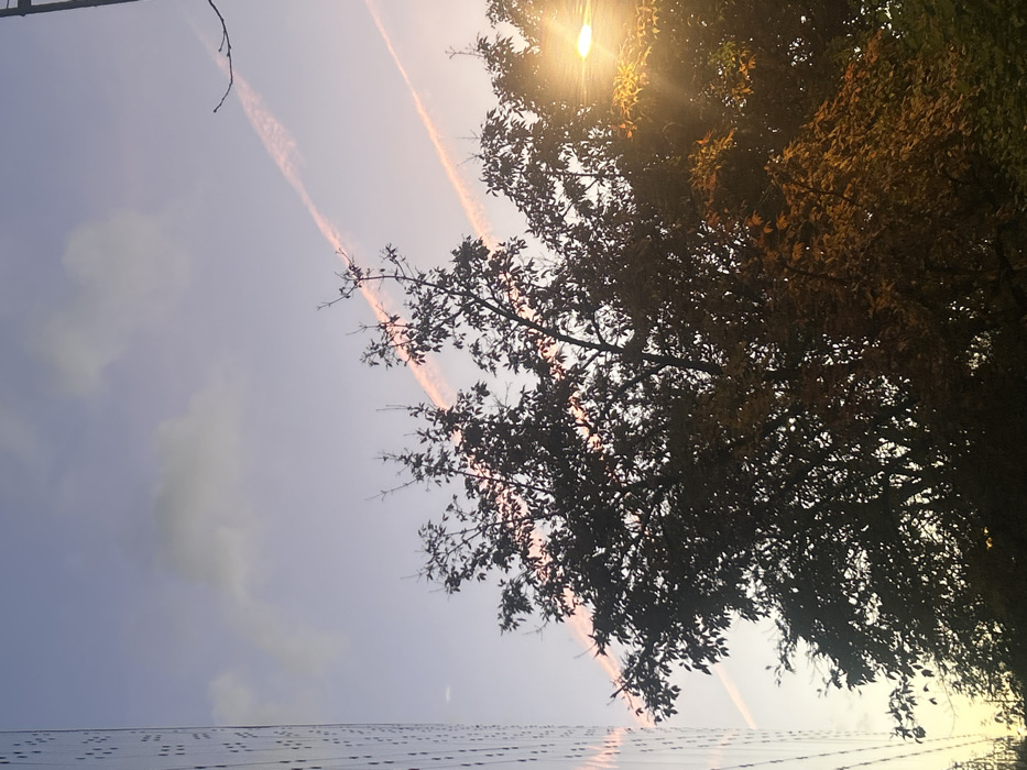 This image captures an outdoor scene in Issy-les-Moulineaux, France, during a transitional period of day, likely dawn or dusk. The upper two-thirds of the frame consist of a sky displaying a gradient from light blue to lavender hues, interspersed with faint grey clouds. Multiple elongated, parallel contrails, exhibiting a pinkish-orange coloration, extend diagonally across the sky from left to right. In the mid-ground and lower right, a substantial deciduous tree or cluster of trees is prominent, largely silhouetted against the sky. The foliage appears dark green, with some leaves on the lower right displaying autumnal orange and brown tones. A bright, artificial yellow-orange light source with distinct lens flare is visible in the upper right, partially obscured by the tree canopy. On the far left, a vertical segment of a modern building is present. It features a patterned facade, possibly composed of reflective or perforated panels, creating a textured, grid-like appearance. No individuals or discernible actions are depicted.