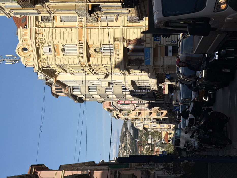 The image depicts a daytime street scene on Via Roma in Sanremo, Italy, looking generally south-east