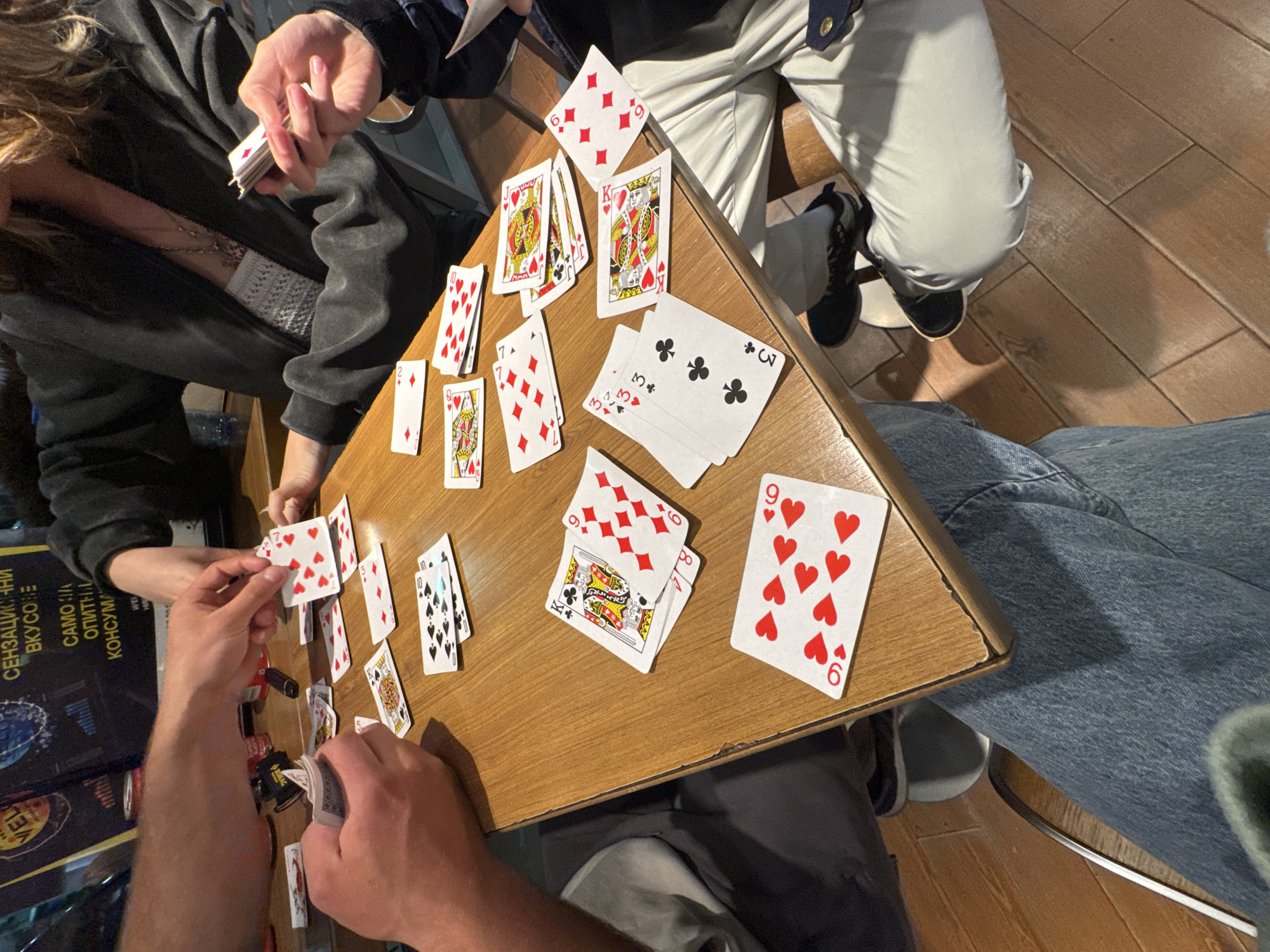 group of people playing cards at a table. The table is wooden and triangular in shape. There are several playing cards scattered on the table, including a King of Diamonds, a Six of Diamonds, and a Six of Hearts. The people are sitting around the table, holding cards in their hands. The background is blurry, but it appears to be a room with wooden floors. One person is wearing white trousers and black shoes, another is wearing blue jeans and another is wearing grey trousers. There is a book visible in the image with text in a Cyrillic alphabet; the OCR output suggests the language is Bulgarian. Based on the Cyrillic text, the city of Polikraishte, Bulgaria is not the location.