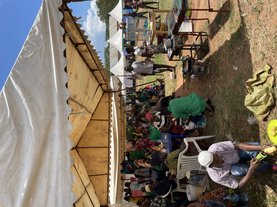 scene outside a large, white tent with scalloped edges, likely located at the Bariadi District Council in Bariadi, Tanzania, as indicated by the provided coordinates