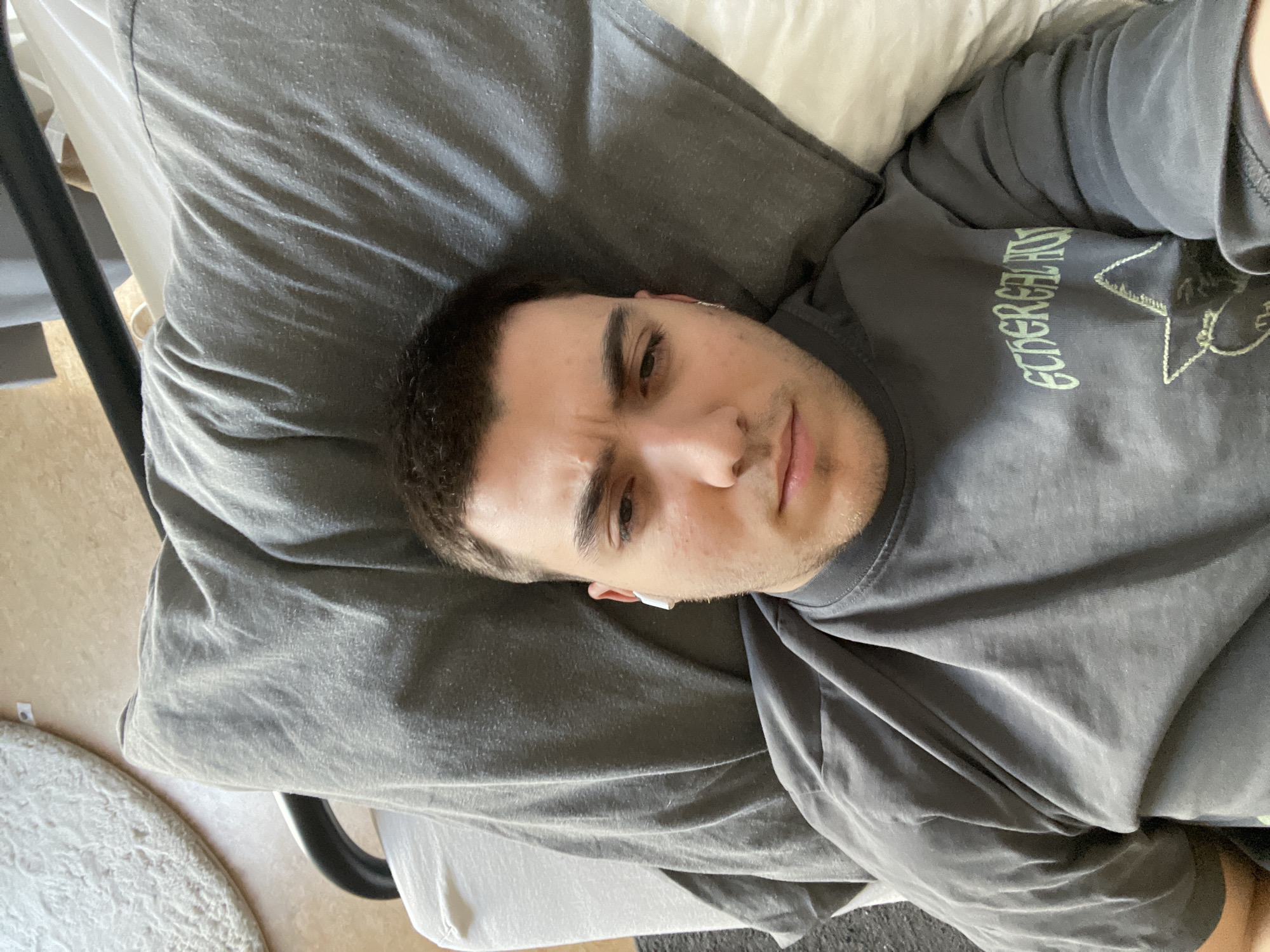 A man is reclining on a bed, likely indoors, with a gray pillow and a white pillow. He is wearing a gray T-shirt with green text and a pentagram-like design. An earbud is visible in his ear. A portion of a rug is visible in the lower left corner. There is no visual information to indicate this scene is located in The Hague, Netherlands.