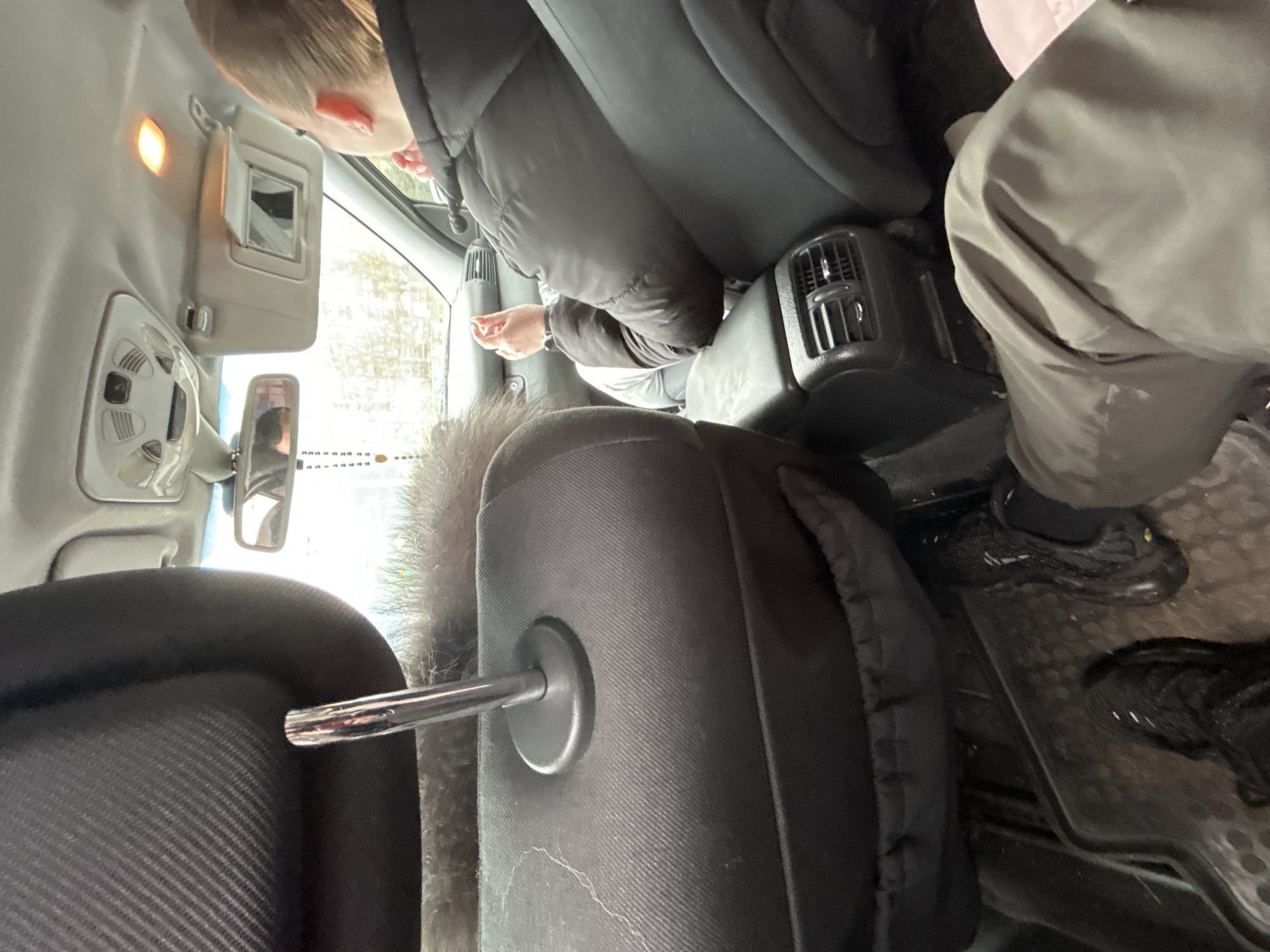 interior of a car. A person with light brown hair is in the front passenger seat. Another person is in the back, wearing gray pants and black sneakers. The back of the front passenger seat has a headrest covered in gray fabric, and the headrest behind it is black. The car’s interior includes a rearview mirror, a sun visor with a mirror, and air vents. The location is unknown and no reference to Vratsa is observable.