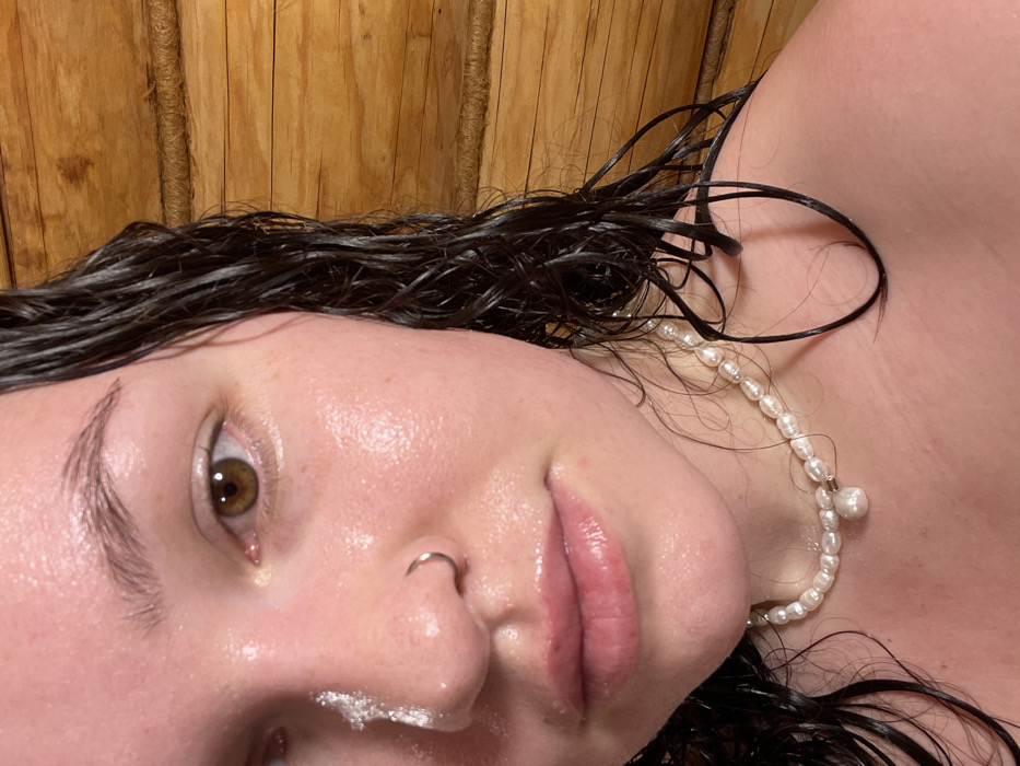 A close-up image depicts the partial face and upper chest of a female subject against a rustic wooden log wall, consistent with an interior space such as a sauna or cabin, in the city of Zav'yalovo, Russia. The subject's skin appears wet and slightly flushed, with individual droplets or sheen visible across the forehead, cheek, and lips. Her dark, wet hair is draped over her right shoulder and neck. The subject's right eye, with a brown iris, is clearly visible, along with a portion of her nose, featuring a silver hoop piercing in the left nostril. A small amount of white, foamy residue is present on the left side of her nose. Her lips are closed and appear moist. Around her neck, she wears a choker-style necklace composed of irregular white pearls, with a larger, distinctive pearl positioned centrally. The wooden background consists of horizontally stacked, light brown logs with visible grain.