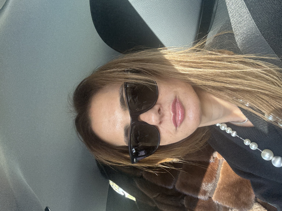 The image depicts a female individual seated within the interior of a vehicle, presumably in Bombarral, Portugal. The woman, who has light brown hair parted on the side, is looking directly at the camera. She is wearing dark, Wayfarer-style sunglasses with the "Ray-Ban" logo visible on the right lens. Her lips are a glossy pink. She is dressed in a dark top, possibly a sweater, and accessorized with a long necklace composed of varying sizes of white, iridescent pearls. A dark seatbelt strap is visible across her chest. To her left and behind her, a brown, textured object resembling a fur coat or blanket is visible. The vehicle's interior features a light gray headliner and dark gray or black seating/paneling. Sunlight illuminates the scene from the right, highlighting her hair and parts of her face, and casting shadows within the vehicle.