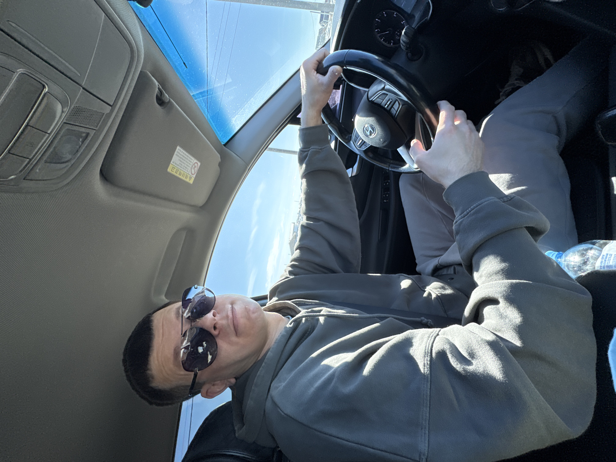 The image depicts an adult male driving a vehicle in the city of Горный, Russia. The male, with short dark hair and wearing dark, reflective aviator-style sunglasses, is dressed in a grey hooded sweatshirt and light-colored trousers. He holds a black steering wheel, branded with a Hyundai logo, with both hands: his left hand is at the ten o'clock position and his right hand at the four o'clock position. He is looking towards the camera with a neutral expression. The vehicle's interior visible details include a grey headliner with an overhead console containing lights and buttons, a grey sun visor displaying a yellow warning sticker with non-English text, and a partially visible dashboard and instrument cluster. A clear plastic water bottle with a blue cap is positioned near the driver's lap. Through the vehicle's windows, a bright blue sky is visible, along with distant utility poles, wires, and a landscape suggesting either winter conditions or a dry environment. The scene is illuminated by clear daylight.