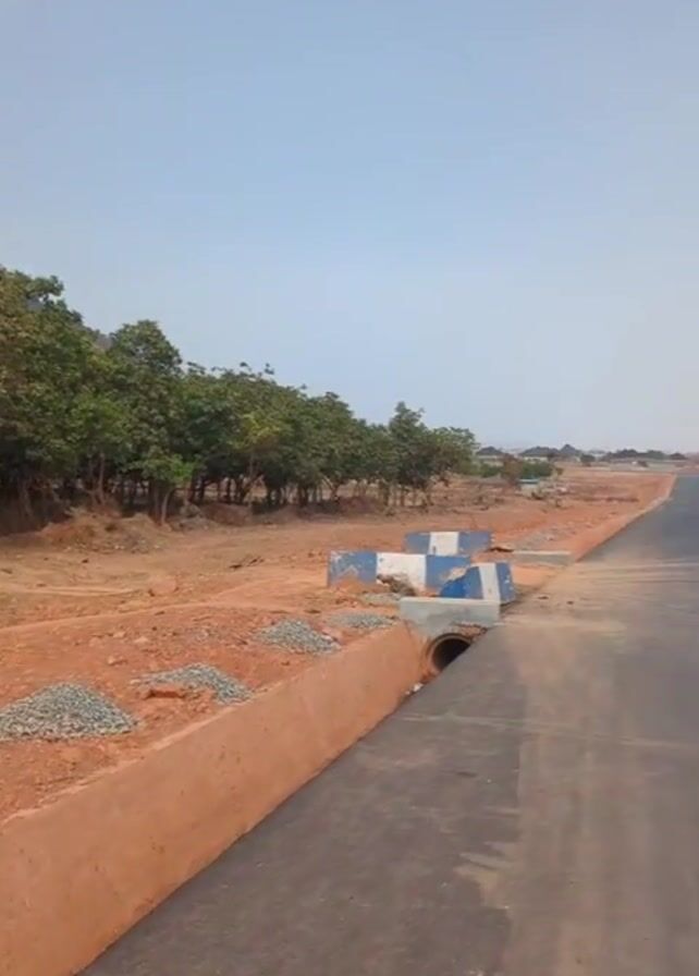 recently paved road with a long, low concrete drainage ditch on one side. The ditch is lined in red-brown earth, and small piles of gray gravel are scattered along it. On the other side of the ditch, there is a sparse line of leafy green trees. The sky is a pale blue, with the faintest wisps of clouds.