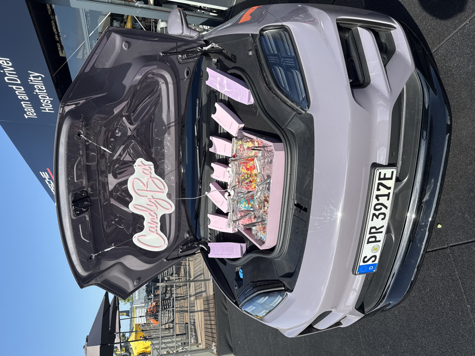 A light purple Porsche Macan electric vehicle, bearing German license plate S PR 3917E, is positioned on dark event flooring under a clear blue sky. The vehicle's front hood (frunk) is open, exposing a "Candy Bar" display. This display features a light pink wooden tray holding several clear glass jars filled with various colorful candies and small serving scoops. Multiple light pink paper bags are arranged around the candy jars. A white sign with "Candy Bar" in pink script is suspended from the underside of the frunk lid. In the background, to the left, black patio umbrellas shade outdoor seating on a wooden deck, with yellow event structures visible further back. To the right, a dark building displays white text identifying it as "PORSCHE Team and Driver Hospitality." This scene is located at an event venue, consistent with the Sachsenring race track in Oberlungwitz, Germany. No individuals are visible.