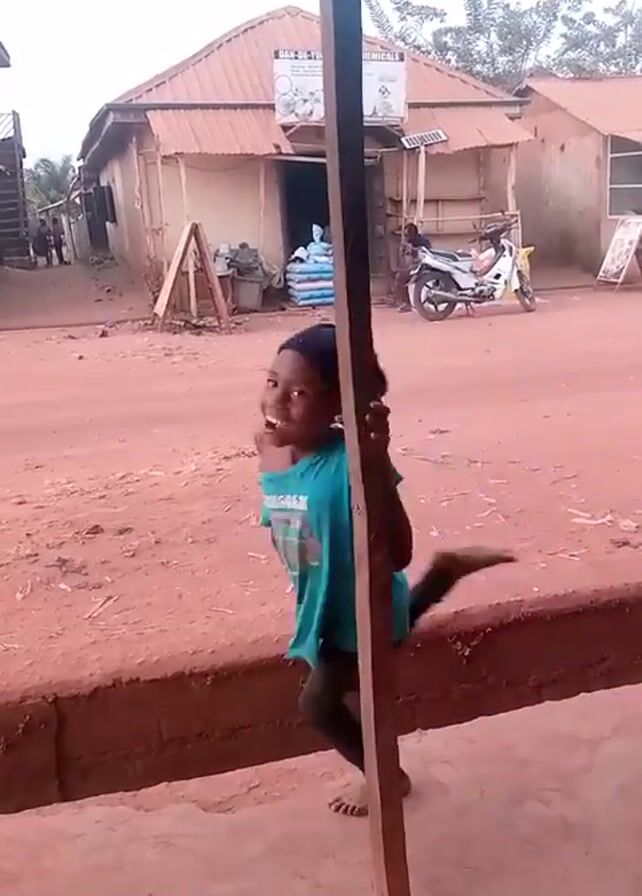 A young child playfully runs toward and holds onto a wooden support beam. The child, dressed in a blue shirt, leggings, and a black head covering, is barefoot. The child playfully peeks around the beam at the camera and then runs away, only to quickly return, looking back and smiling. The scene takes place on a dirt road in front of a building with a sign on it. In the background, there is a motorbike, other buildings, and some people walking.