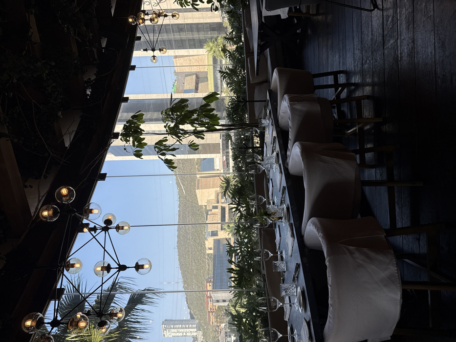 A restaurant scene featuring a long table set for a formal meal, with elegant white chairs and glassware