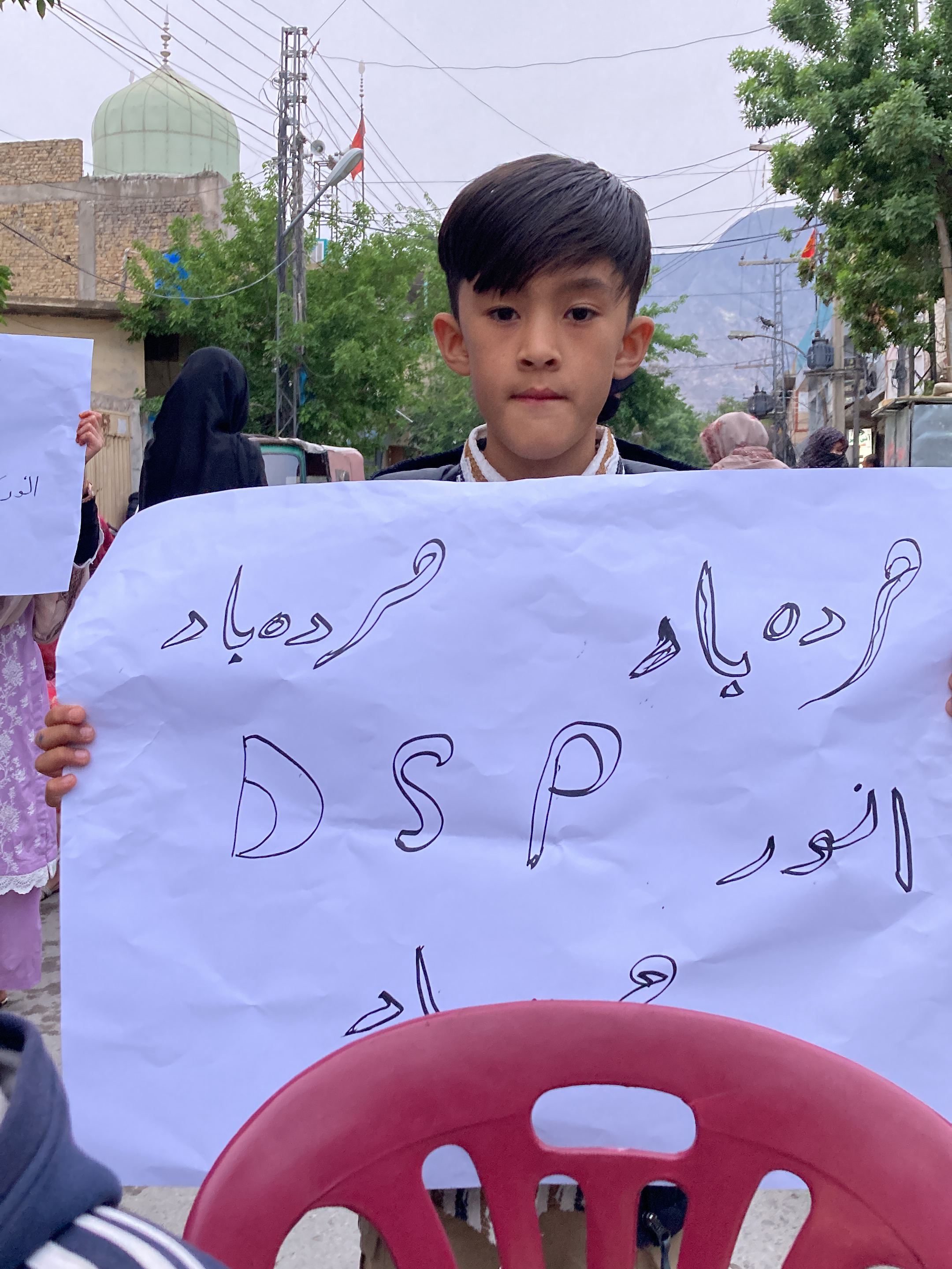 A young boy stands holding a sign with text written in Urdu, and “DSP Anwar” in English. The text is black on a white poster board. A crowd is visible behind the boy. A building with a dome is in the background. The photo was taken outdoors during daylight hours.