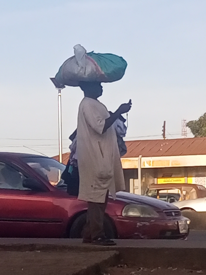 The image depicts an urban street scene in the city of Unknown, Unknown, during daylight hours under a clear, light blue sky. In the mid-ground, an individual, appearing male, stands in profile facing right. They are dark-skinned and wear a light-colored tunic or kaftan over dark trousers and dark shoes. A large, irregularly shaped bundle, consisting of a white and green sack, is balanced on their head. Their right hand holds a dark-colored mobile phone, which they appear to be operating, while a piece of light-colored fabric is draped over their left shoulder. To the individual's left and slightly behind, the front and side of a red Honda Civic sedan are visible, exhibiting minor damage to the front bumper area below the passenger-side headlight. A metallic utility pole is positioned directly behind the individual. In the background, a building with a reddish-brown corrugated metal roof and a light-colored facade is present, featuring a yellow sign. Further right in the background, a cream-colored older model vehicle and a white vehicle are partially visible. Utility lines are faintly discernible across the sky, and a communication tower is visible on the far right horizon, alongside some tree foliage. A concrete curb occupies the lower foreground.