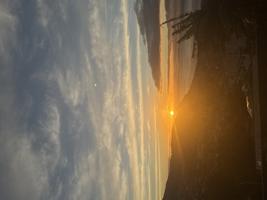 The image displays an elevated panoramic view of Funchal, Portugal, at either sunrise or sunset. The sun, a prominent golden orb, is low on the horizon, positioned slightly left of center, illuminating the scene with intense orange and yellow light, casting significant lens flares. Its rays extend across the mid-ground, highlighting the urban landscape. The sky above features scattered cirrus and altocumulus clouds, transitioning from warm orange and yellow tones near the horizon to cooler blues and greys higher up. A distinct, slender crescent moon is visible in the upper-right portion of the sky. The left and central mid-ground reveal the densely built-up hillsides of Funchal, with numerous residential and commercial structures cascading down towards the coast. These buildings appear as clustered forms, some partially silhouetted, others catching direct sunlight. To the right and in the background, the Atlantic Ocean extends to a hazy horizon, with faint silhouettes of distant landmasses visible. In the immediate foreground, on the far right, dark, out-of-focus tropical foliage, resembling palm fronds, is present. A partial view of a dark roofline or structure is visible at the very bottom edge of the image, indicating the elevated vantage point. No individuals, specific actions, or interactions are discernible within the frame.