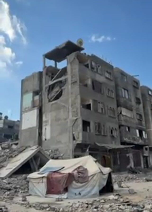 The video depicts a scene of extensive destruction, likely from a recent conflict or disaster. A large, multi-story building stands partially ruined, with a gaping hole in its facade. Debris and rubble litter the ground. A makeshift tent is set up amidst the wreckage, suggesting displacement or temporary shelter. The sky above is blue with scattered clouds, providing a stark contrast to the devastation below. There are no people visible in the frame.