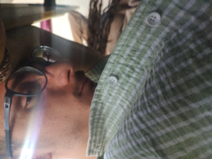 The image depicts an indoor scene within the city of Ash-Shaghour Municipality, Syria. The foreground features a close-up of a light green and white plaid shirt, with two white buttons clearly visible on the fabric. In the mid-ground, the right side of a person's face is partially visible, oriented downwards, displaying light to medium skin tone, short dark hair, and black-rimmed glasses. A prominent lens flare is visible on the right lens of the glasses, indicating a light source. In the blurred background, the upper portion of another individual with dark, curly hair, possibly dreadlocks or braids, is discernible. A dark table surface is visible beneath the main subject's head, with a light-colored wall and a dark, indistinct object, possibly purplish, in the out-of-focus far background. No explicit actions or interactions are clearly depicted beyond the main subject's downward gaze.