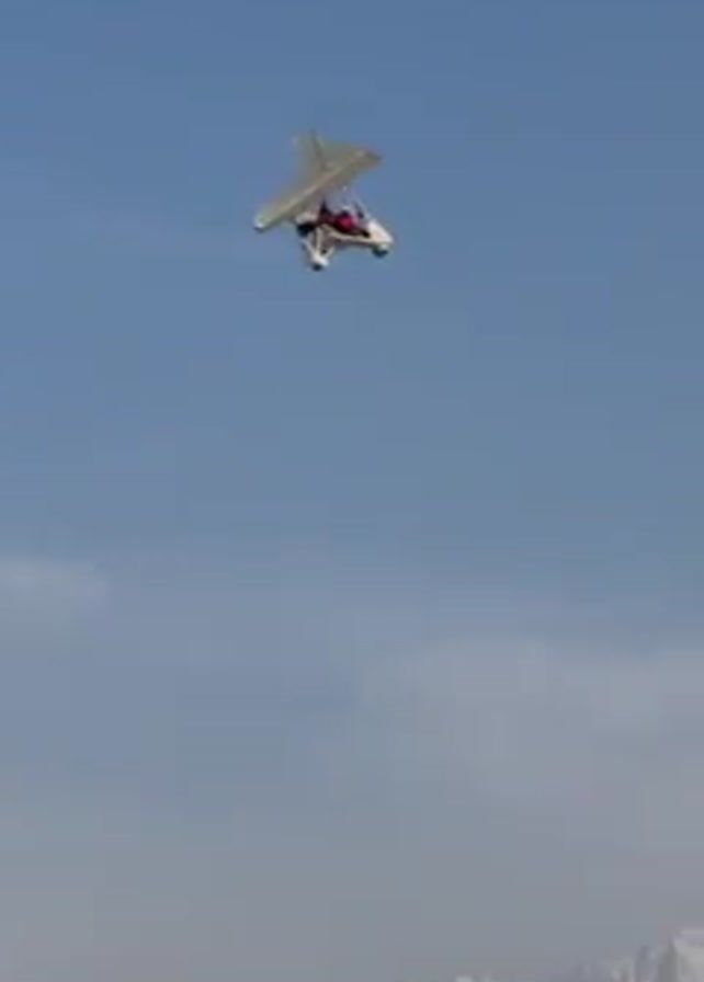 small, light aircraft with a hang glider wing flying in a clear blue sky
