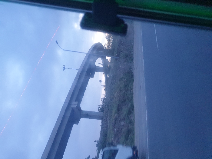 An elevated highway dominates the shot. It curves from left to right against a cloudy sky with sunlight breaking through. Greenery covers the embankment beneath the structure. A gray road runs alongside the embankment. A portion of what appears to be a vehicle is visible in the lower left corner. A portion of the window frame is also visible in the top.