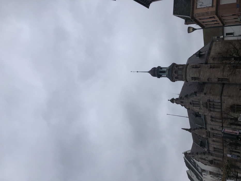 The image captures a street scene in Saverne, France, under an entirely overcast and grey sky that occupies the upper majority of the frame