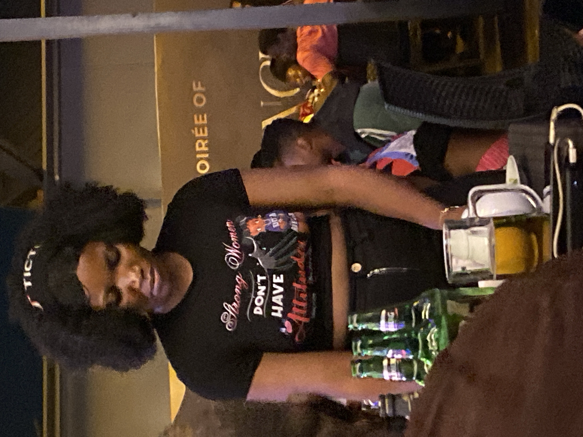 At an establishment named "Soirée Of" in Kubwa, Nigeria, a woman with an afro wearing a black t-shirt that reads "Strong Women DON'T HAVE Attitudes" is positioned at a table. In front of her are several green glass bottles, a glass of amber liquid, and electronic charging cables. Other patrons are visible behind her. The environment suggests an evening setting with indoor and outdoor space.