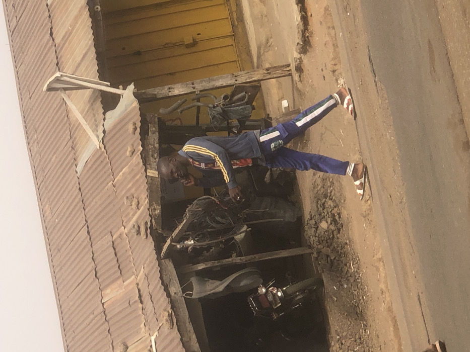 The scene is set in Tukur Tukur, Nigeria, depicting a street adjacent to a rudimentary workshop under a hazy sky