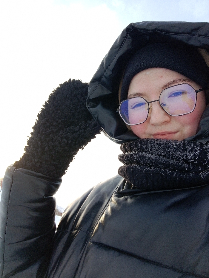 A close-up, low-angle photograph depicts an individual, likely female, outdoors in Kuyeda, Russia, dressed in winter clothing