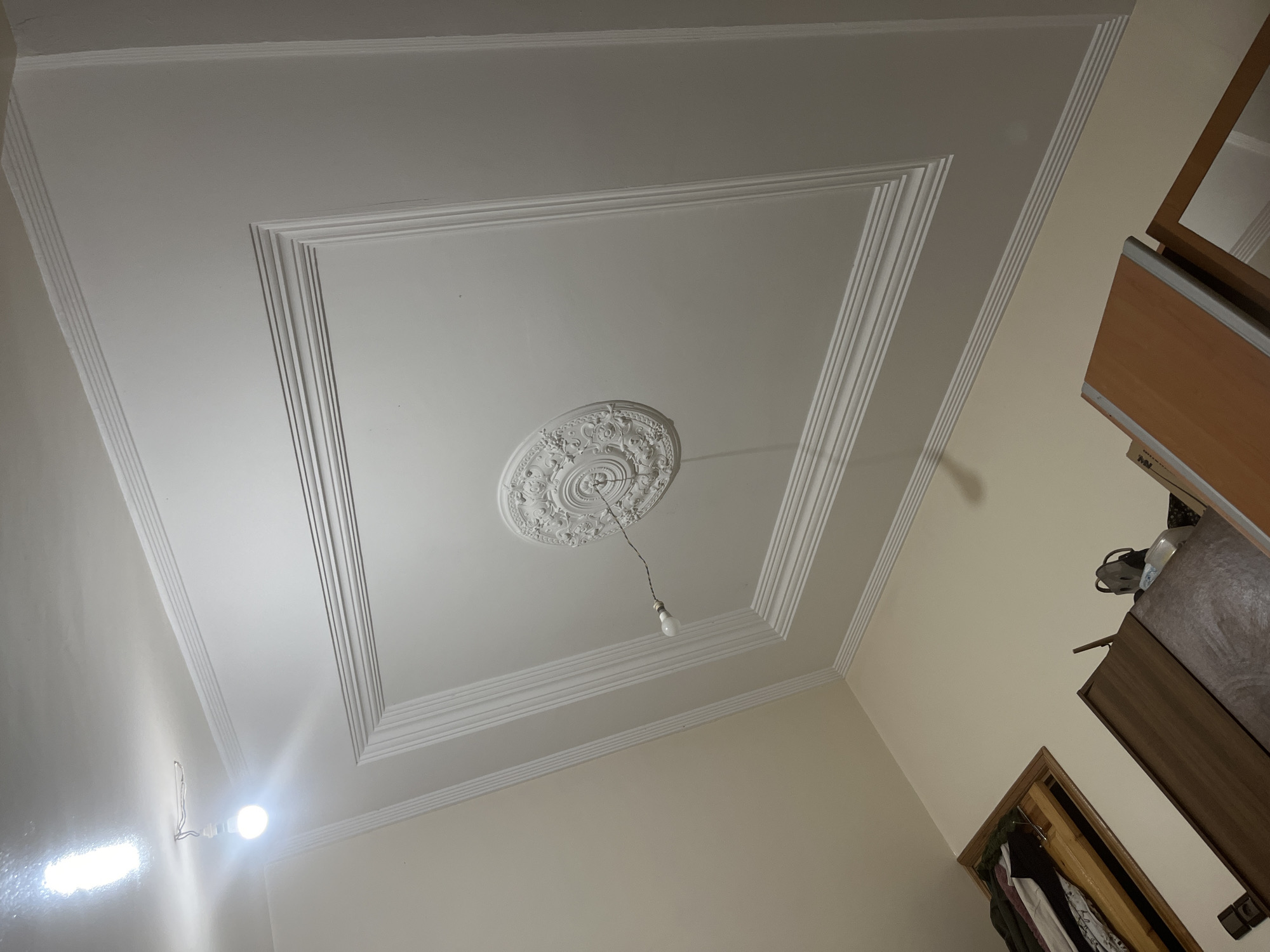 The image displays an interior room located in Fez, Morocco. The scene is dominated by a bright, off-white ceiling featuring elaborate, layered plaster molding. A central circular medallion with intricate floral and scrollwork designs is present, from which a single, bare, bright white LED light bulb hangs by exposed wires. This light casts a prominent glare on the ceiling directly above it. Surrounding the central medallion are multiple rectangular recessed frames, also in white plaster, creating a tiered effect with fine linear detailing. The walls are painted a light beige or cream color and meet the ceiling with simple, clean lines. In the lower right foreground, the top of a light brown wooden cabinet or wardrobe with a silver-colored edge is visible, holding a black bag and a clear plastic container. In the lower left, a dark brown wooden-framed opening, possibly a shelf or part of a wardrobe, contains several pieces of folded clothing in various colors (e.g., dark green, white, patterned) and what appears to be a wooden hanger or rail. No individuals are present, and no actions or interactions are depicted. The camera angle is directed upwards, capturing the ceiling and the upper portions of the room's contents.