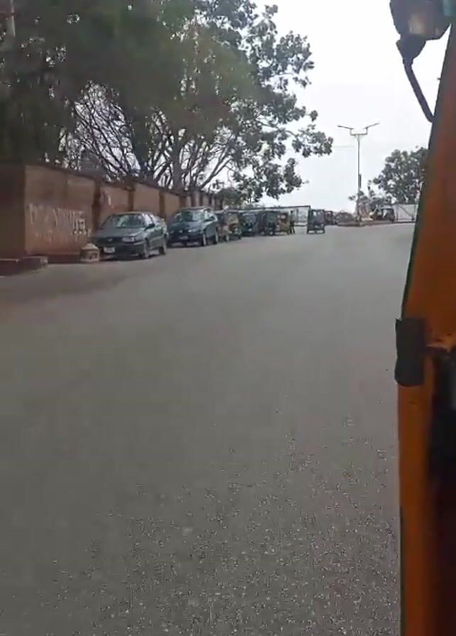 n asphalt road with parked cars and auto-rickshaws. A person in light-colored clothing walks along a wall to the left of the road. In the distance, a group of people can be seen standing near a white barrier. The video is taken from inside an auto-rickshaw with the side of the vehicle visible in the frame. The weather appears overcast.