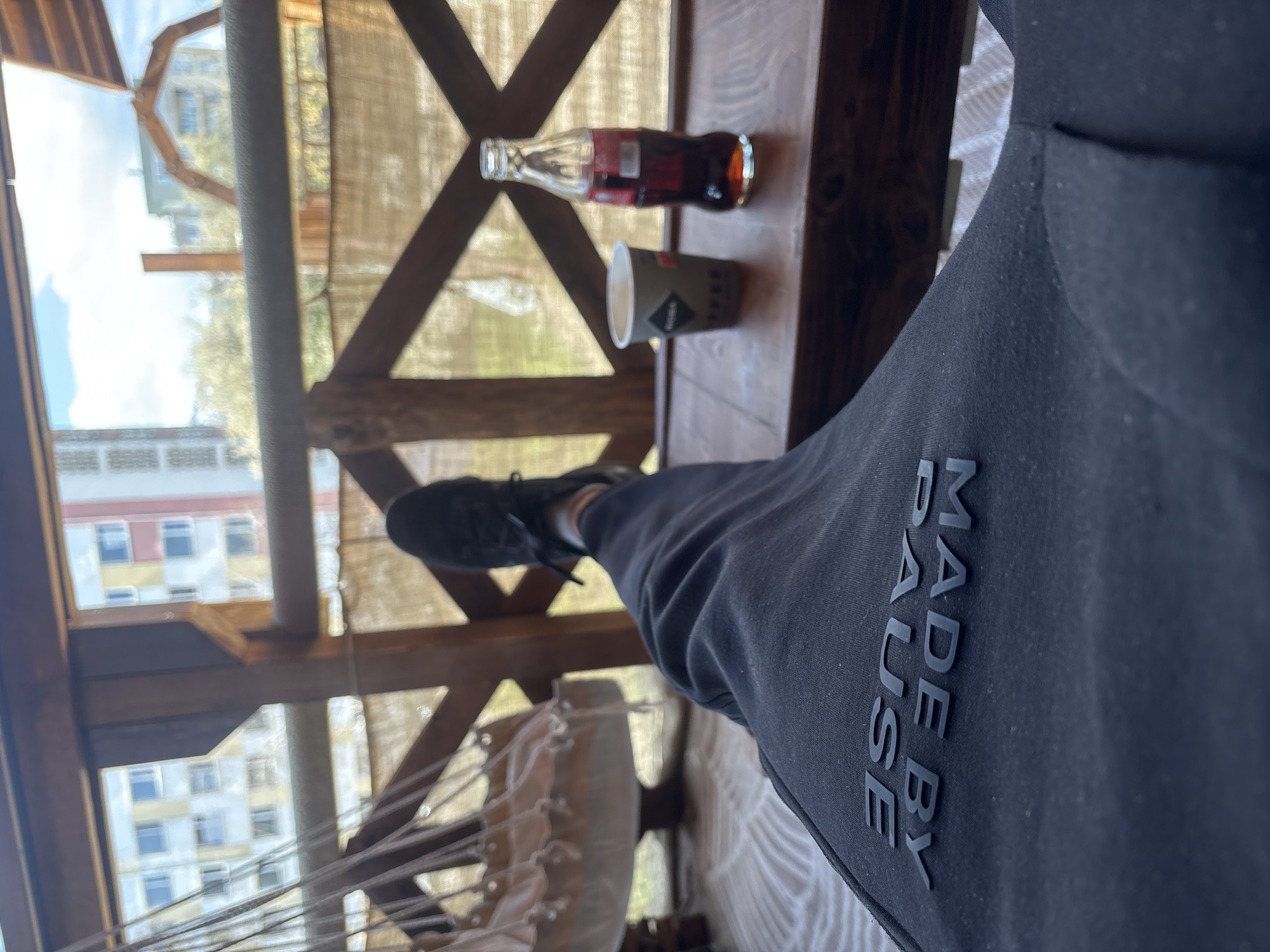 The image, taken at an angle, shows a partial view from a shaded structure, possibly a gazebo or covered patio. A person wearing dark-colored sweatpants with the phrase "MADE BY PAUSE" vertically printed on the leg, with their foot propped up on a wooden table. The table also holds a glass Coca-Cola bottle and a paper cup with a logo. Beyond the structure's framework, there's a glimpse of a cityscape with multi-story buildings, including one with a yellow and white facade with visible windows. The architecture suggests a location within the city of Sofia, Bulgaria, a common area for leisure. There are ropes in the foreground, likely part of a hammock or some other seating arrangement within the structure.