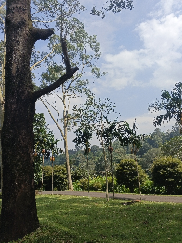 Lush greenery fills the landscape under a partly cloudy sky. Tall trees dominate, one with a thick, dark trunk in the foreground. A variety of other trees, including palm trees, line a paved pathway. Further back, a dense, green forest rises up the side of a hill. Manicured lawns of grass complete the scene.