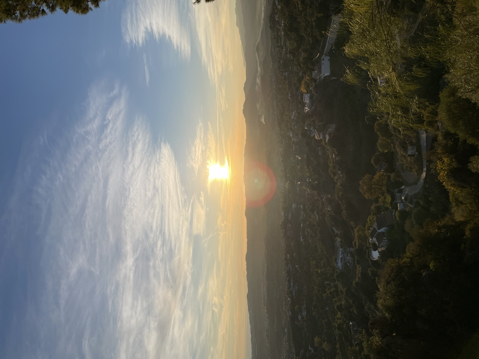 The photo captures a vibrant sunset viewed from a high vantage point. The sky is predominantly blue with wispy clouds, transitioning to a golden hue near the horizon. The sun shines brightly, creating a lens flare effect. Below, a lush, green landscape with scattered buildings and winding roads stretches into the distance, fading into shadows. The image is slightly rotated, offering a unique perspective of the scene.