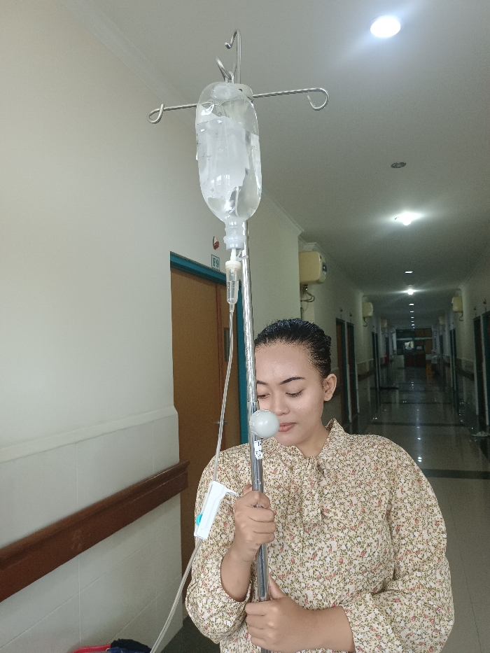 An adult female stands in a brightly lit indoor corridor of a medical facility in Margorejo, Indonesia