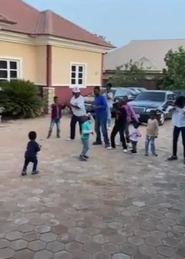 A group of about ten people, including several young children, dance in the paved area of a driveway in front of a yellow house