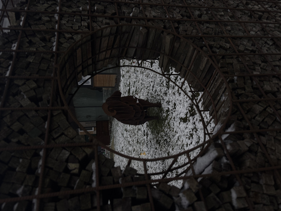 The image displays a metallic ram sculpture viewed through a circular opening in a gabion wall filled with wooden blocks, located in Schifflange, Luxembourg. The foreground is dominated by a heavily rusted metal mesh gabion wall packed with numerous irregularly cut wooden blocks, some featuring light snow coverage. A large circular aperture, approximately centered in the frame, provides a clear view of the scene beyond. Within this opening, a dark reddish-brown metallic sculpture of a ram, characterized by prominent, curled horns, stands on a patchy ground consisting of sparse snow and visible green grass. The ram faces towards the right of the frame, positioned with its body oriented slightly towards the viewer. In the background, behind the sculpture, architectural elements of industrial or commercial buildings are discernible, including a dark-toned structure and a lighter building with visible wooden paneling and a partially legible sign. The scene is illuminated by daylight under overcast winter conditions, with no human figures or active interactions present.